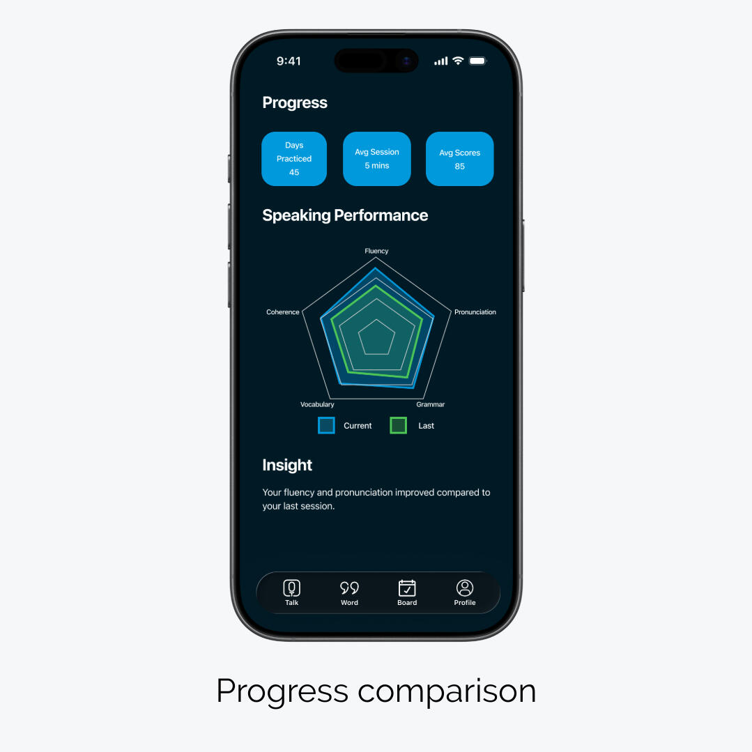 Visualize changes over time and understand how your speaking performance evolves across sessions.