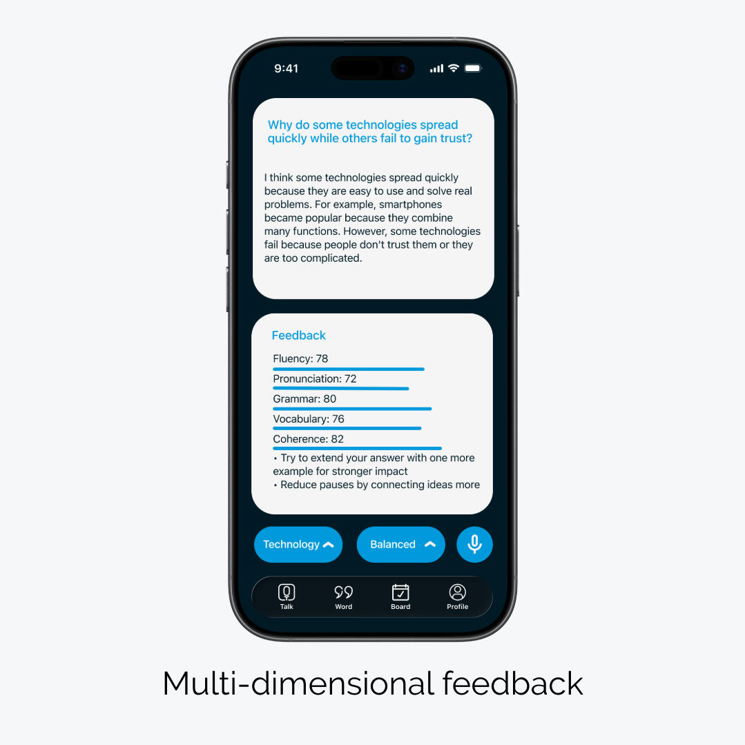 Get clear feedback across fluency, pronunciation, grammar, vocabulary, and coherence.