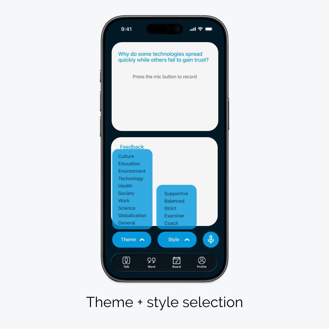Switch themes and response styles to create more varied speaking practice.